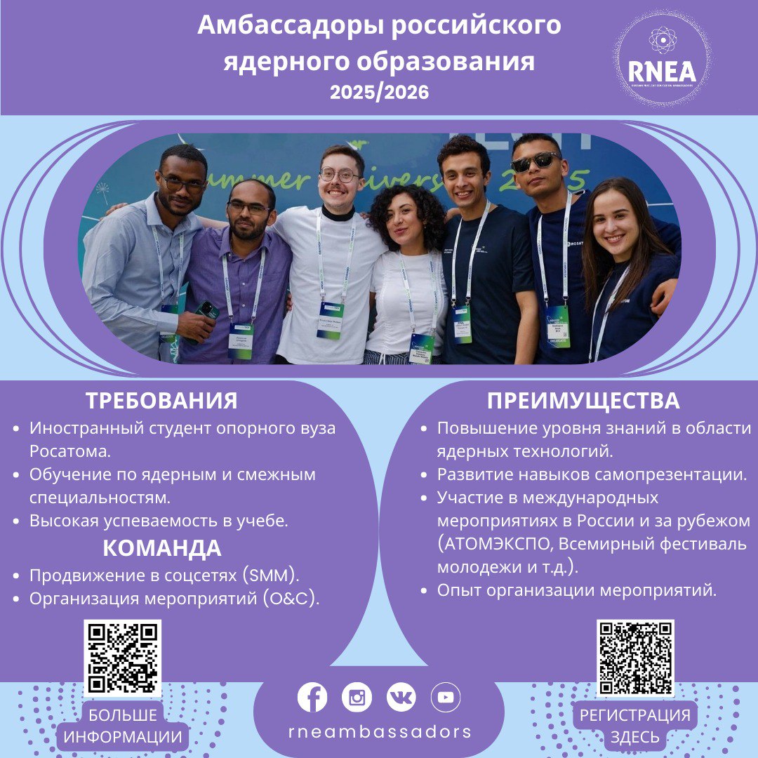 Открывается набор в международный проект «Амбассадоры российского ядерного образования» - сообщество молодых лидеров, обучающихся по ядерным и смежным специальностям, готовых делиться знаниями, опытом и энергией ради продвижения лучших практик российского профильного образования и инновационных достижений в атомной отрасли и смежных сферах.