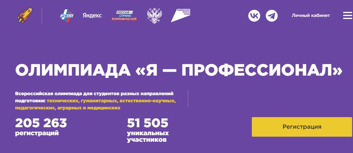 Всероссийская олимпиада студентов «Я – профессионал» – один из флагманских проектов президентской платформы АНО «Россия – страна возможностей», который реализуется при поддержке Министерства науки и высшего образования России в рамках федерального проекта «Социальные лифты для каждого» национального проекта «Образование».