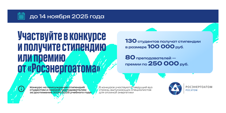 До 14 ноября Концерн «Росэнергоатом» проводит ежегодный Конкурс на присуждение именных стипендий студентам и премий преподавателям профильных вузов. Победители конкурса – студенты – получат стипендии по 100 000 рублей единоразово, а премии преподавателям составят единоразово по 250 000 рублей.