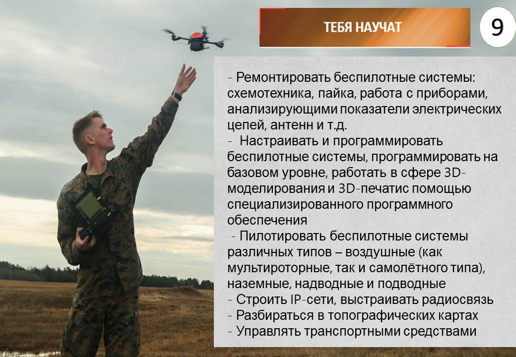 – Получение уникальных знаний навыков по применению беспилотных систем, востребованных, как в Минобороны России, так и в других силовых ведомствах, а также во многих отраслях экономики.