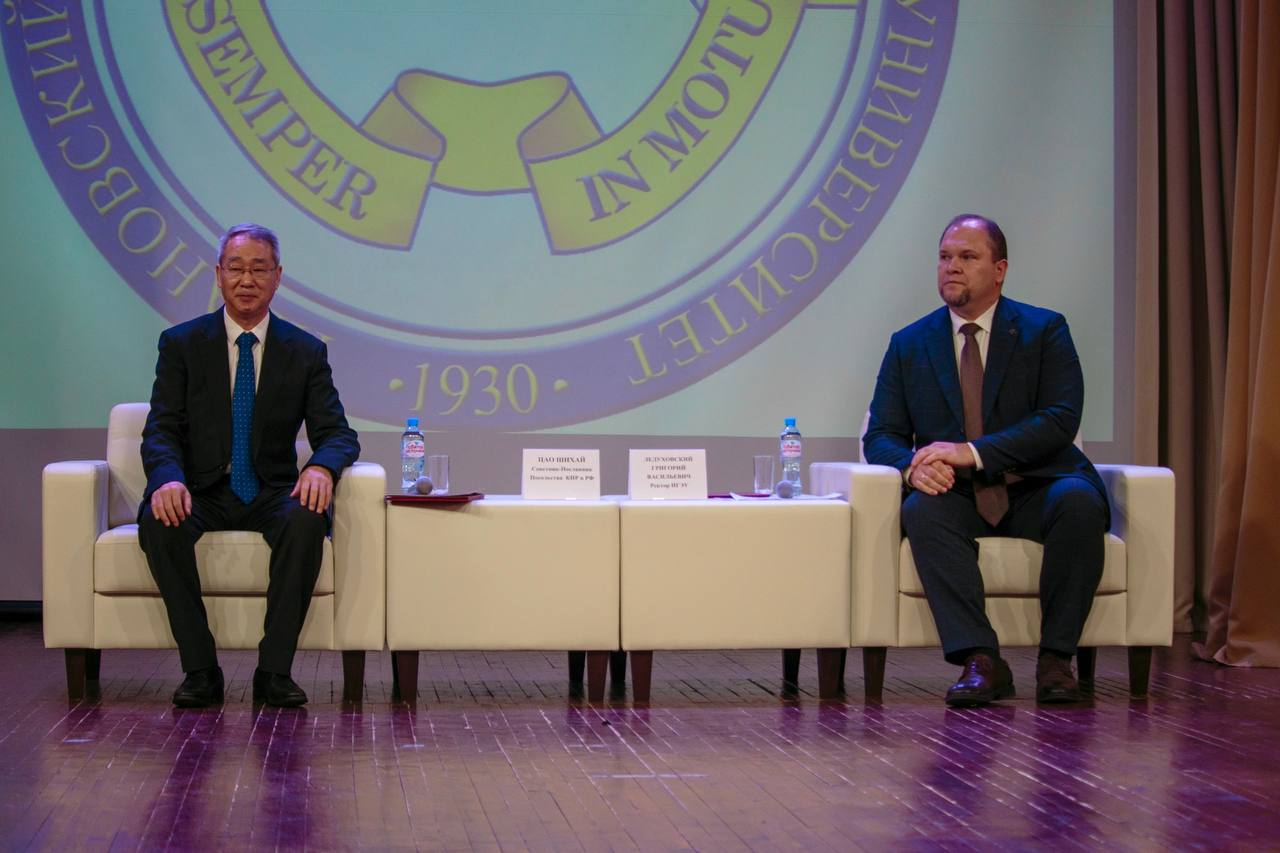 Господин Цао Шихай подчеркнул, что взаимодействие наших стран с каждым годом укрепляется: в настоящее время в России обучаются 60 тысяч китайских студентов, около 20 тысяч российских юношей и девушек проходят обучение в КНР. Также господин Цао Шихай отметил высокий уровень владения студентами ИГХТУ китайским языком (в рамках форума «РуКи» некоторые мероприятия проводились на китайском языке).