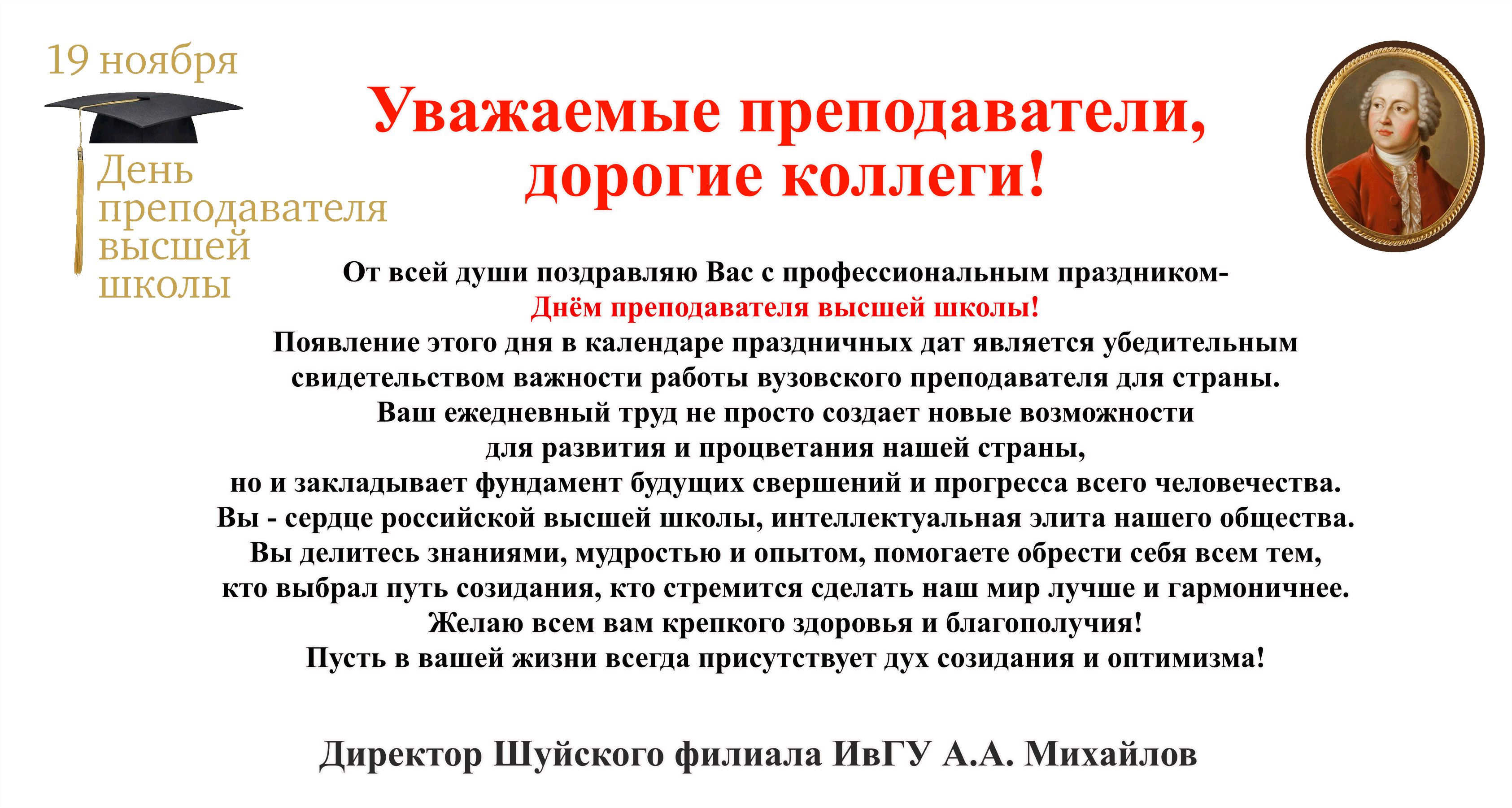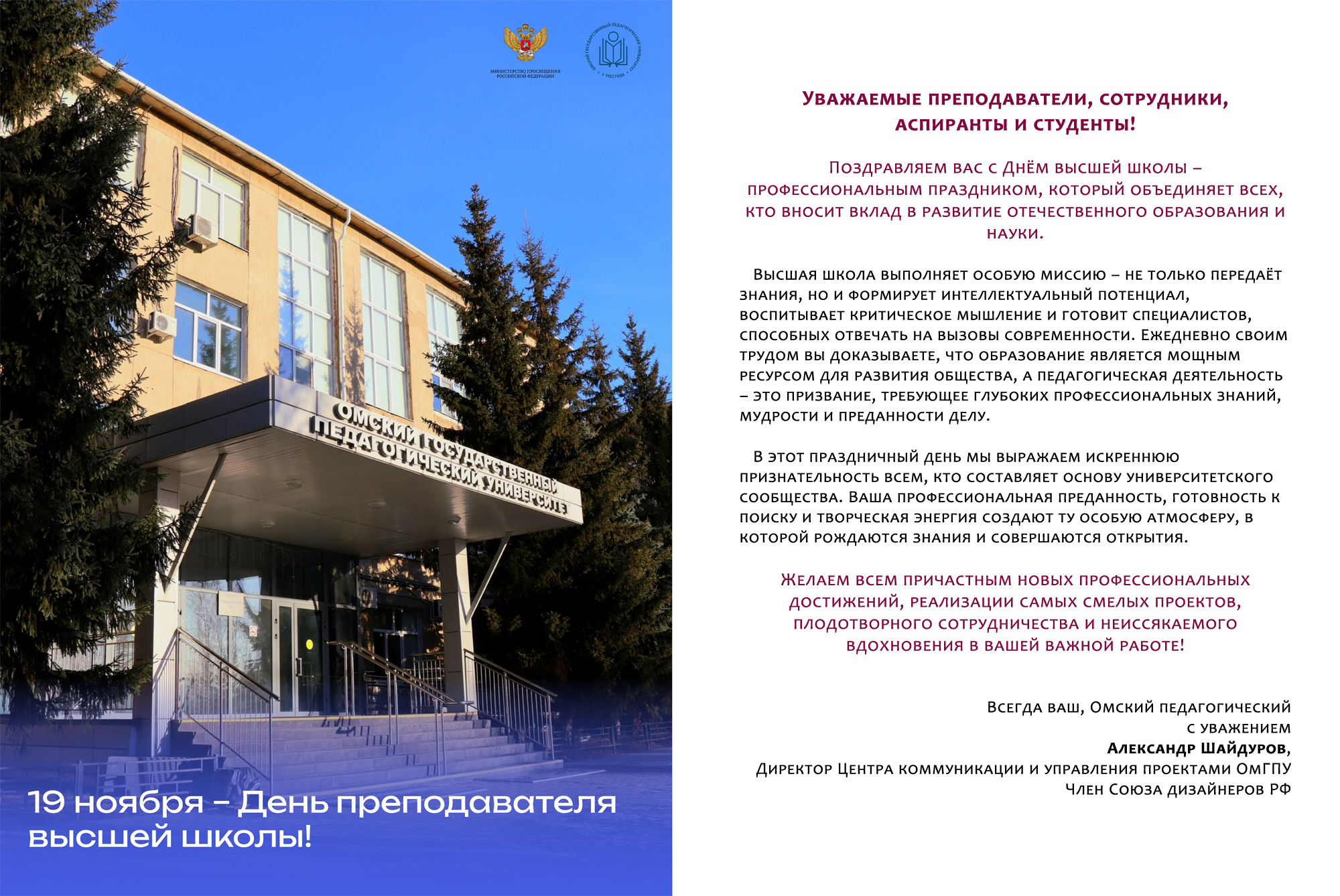 Сегодня мы отмечаем День преподавателя высшей школы – праздник, который объединяет тех, кто посвятил свою жизнь образованию и развитию будущих поколений. Труд преподавателей вуза бесценен, их мудрость и опыт – наше общее богатство!