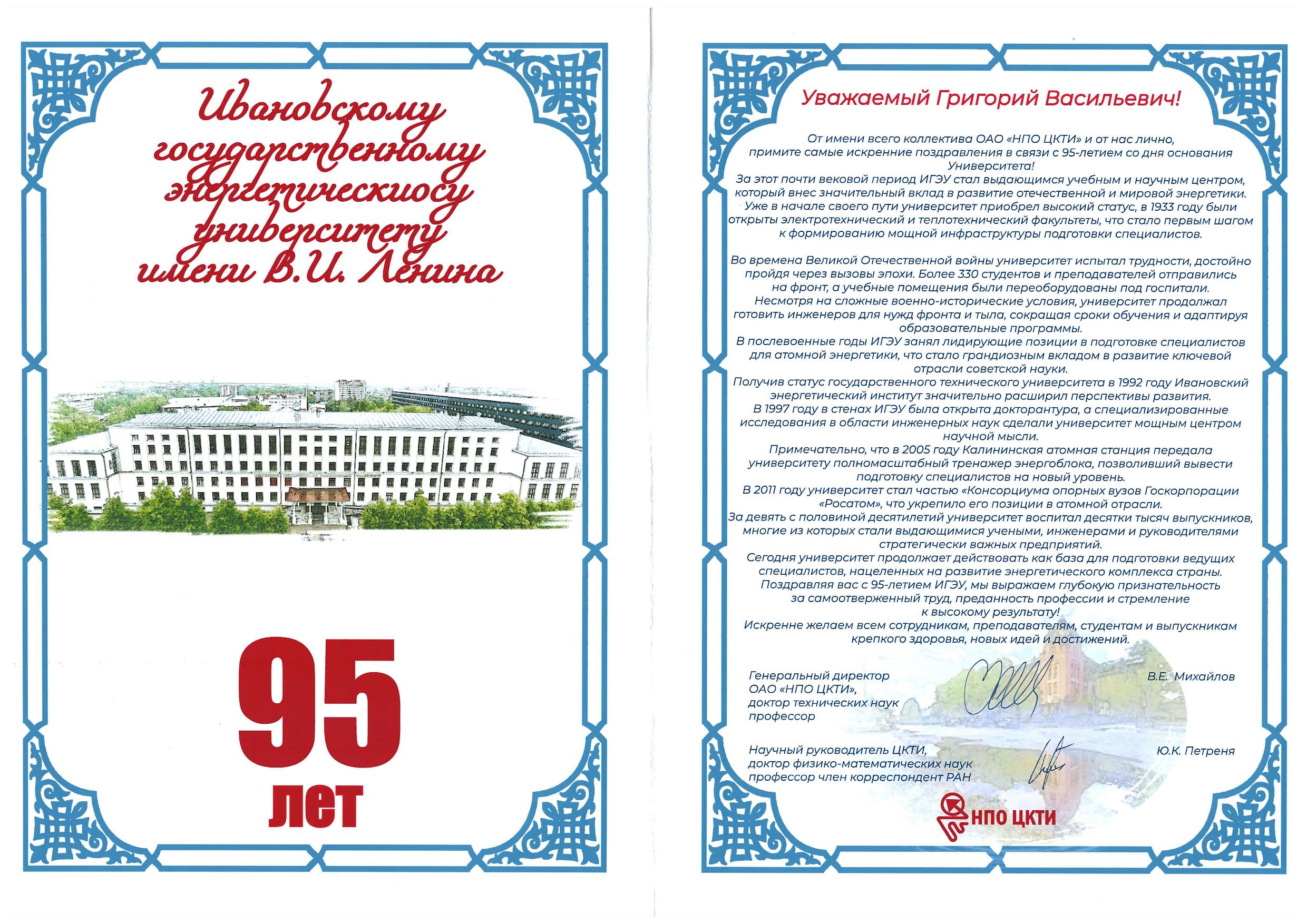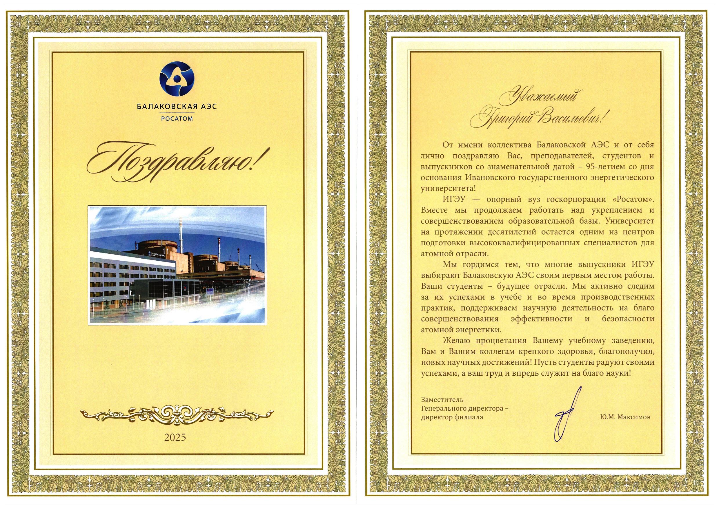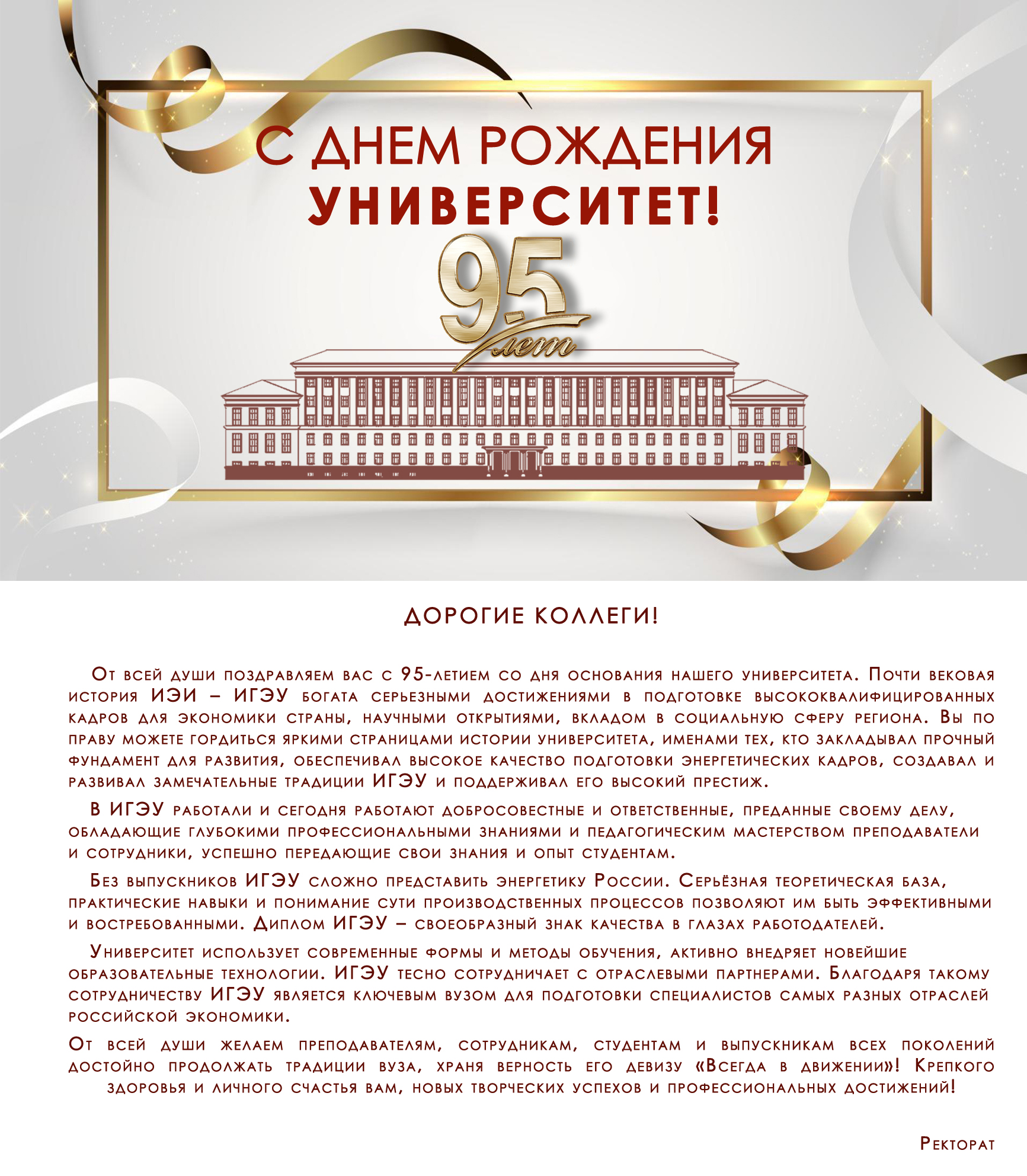 admin 27 November 2025 Дорогие коллеги, от всей души поздравляем вас с 95-летием со дня основания нашего университета. 126 просмотров Подразделение Ректорат Вложения Поздравление_Ректората ИГЭУ.jpg (1.53 МБ) Поздравление_Заместителя Генерального директора Балаковской АЭС.jpg (866.15 КБ) Поздравление_Генерального директора НПО_ЦКТИ.jpg (724.25 КБ) Категории Новости Главные новости