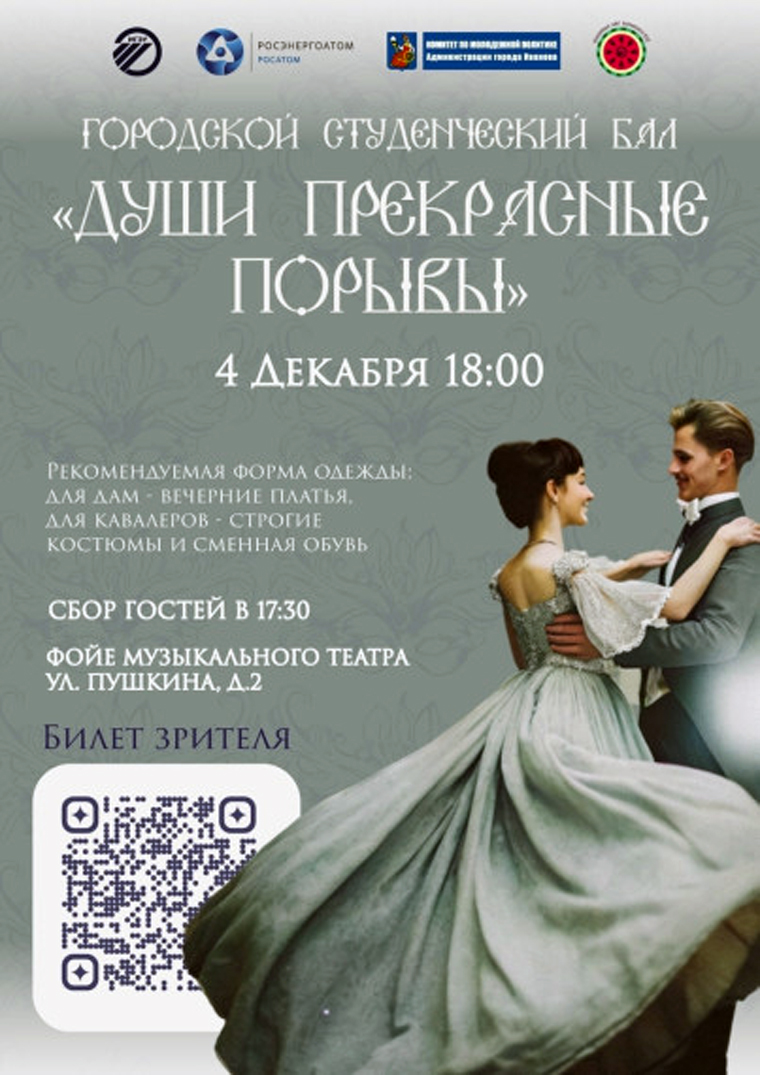 Напомним, организаторами Городского студенческого бала «Души прекрасные порывы» выступили ФГБОУ ВО «Ивановский государственный энергетический университет имени В.И. Ленина», АО «Концерн Росэнергоатом», комитет по молодежной политике Администрации города Иванова, МКУ «Молодежный центр».